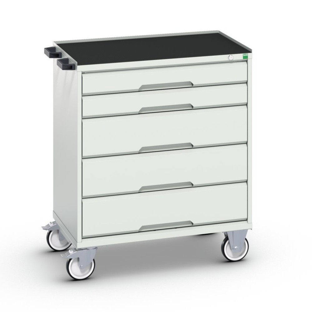 - Avec solide caisson en tôle d’acier entièrement soudé, poignées de poussée, tiroirs à extension totale et blocage tiroirs, jeu de roulettes de 125 mm de diamètre