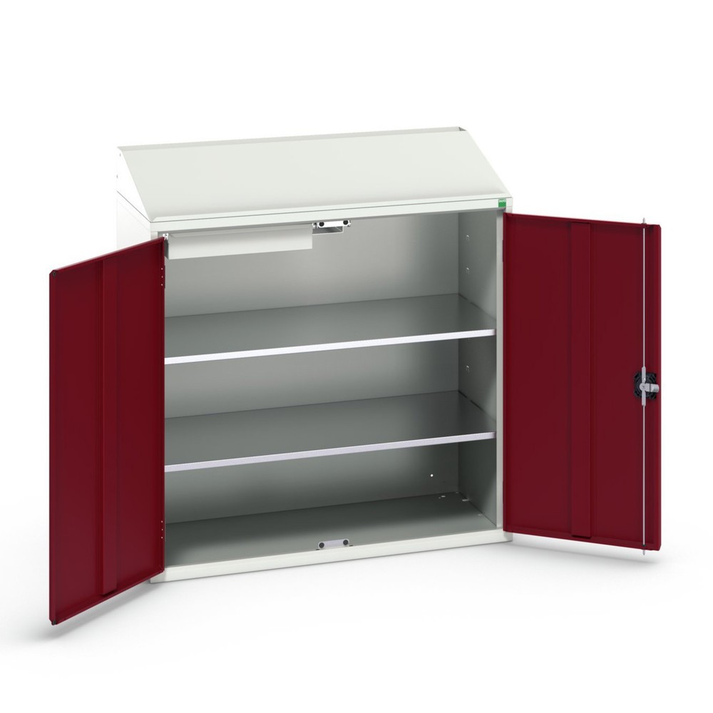 - Avec caisson en tôle d'acier soudée avec tablette écritoire inclinée, armoire verrouillable, deux portes renforcées, deux tablettes réglables en hauteur en tôle d'acier galvanisée (capacité de charge : 35 kg) et deux bacs extensibles de demi-largeur (capacité de charge 10 kg)