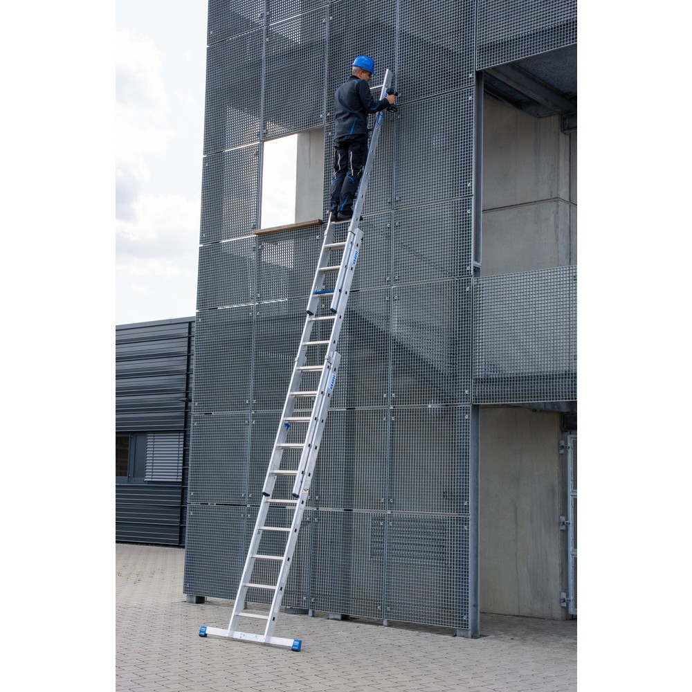 L’échelle polyvalente se compose de 3 parties modulables permettant de créer une échelle simple et coulissante ou un escabeau double à marches. Les montants, échelons et marches bien sertis en profilé en aluminium avec arrêtes renforcées garantissent une stabilité longue durée. Grâce aux embouts de pied antidérapants et aux marches entièrement profilées, vous travaillez confortablement et en toute sécurité. Un échelon large de sécurité bleu indique le passage des échelons aux marches. Les sangles cousues dans des languettes métalliques empêchent tout écartement excessif.