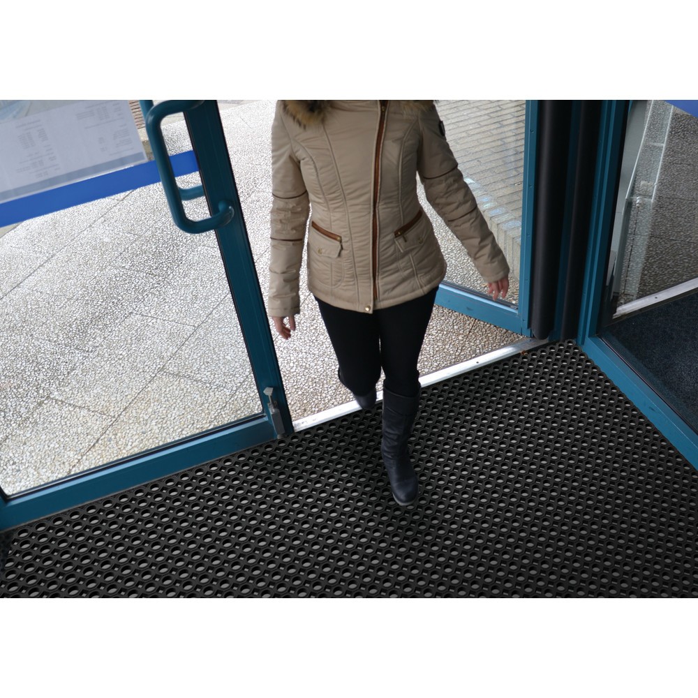 Le paillasson en nid d’abeilles est fabriqué dans un mélange durable à base de caoutchouc. Ce matériau est particulièrement résistant et résiste sans problèmes aux fortes sollicitations générées par le passage des piétons. Le tapis en nid d’abeilles convient pour l’intérieur et l’extérieur où il retient de manière fiable la saleté grossière sur les semelles des chaussures telle que la boue ou le sable. De plus, le tapis est antidérapant et garantit une bonne station debout. Pendant son utilisation, le paillasson réduit les bruits de pas et atténue les vibrations.
