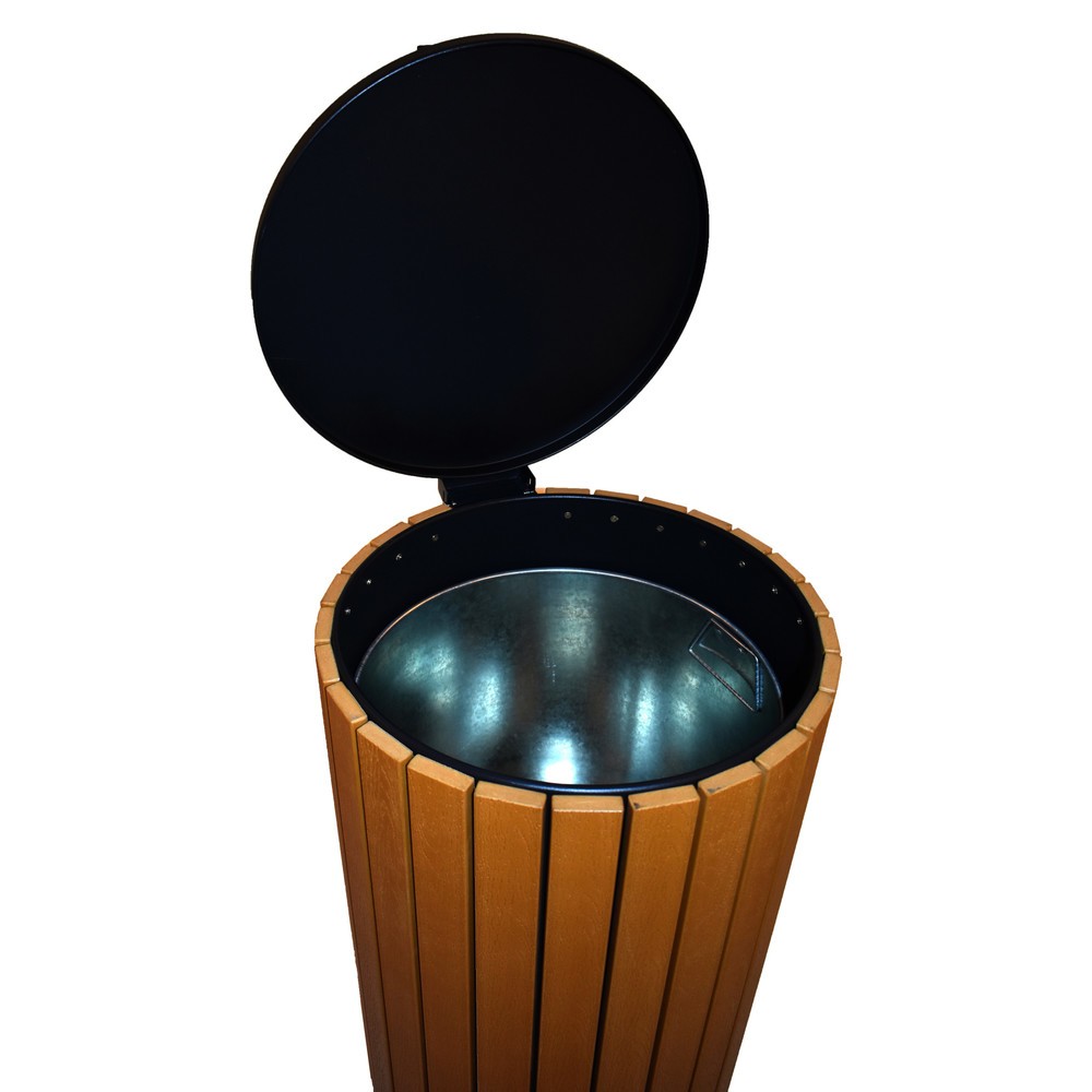 Cette poubelle aspect bois offre une solution élégante pour la collecte des déchets en extérieur. D’une contenance de 90 litres, elle est idéale pour les endroits très fréquentés comme les parcs, les stations-service et les lieux publics. Les lamelles aspect bois en plastique de haute qualité et le contenant intérieur galvanisé garantissent sa longévité et sa résistance aux intempéries. Le fond et les charnières sont en acier inoxydable, pour une protection supplémentaire contre la corrosion. Le contenant peut être fixé au sol afin de sécuriser l’installation.