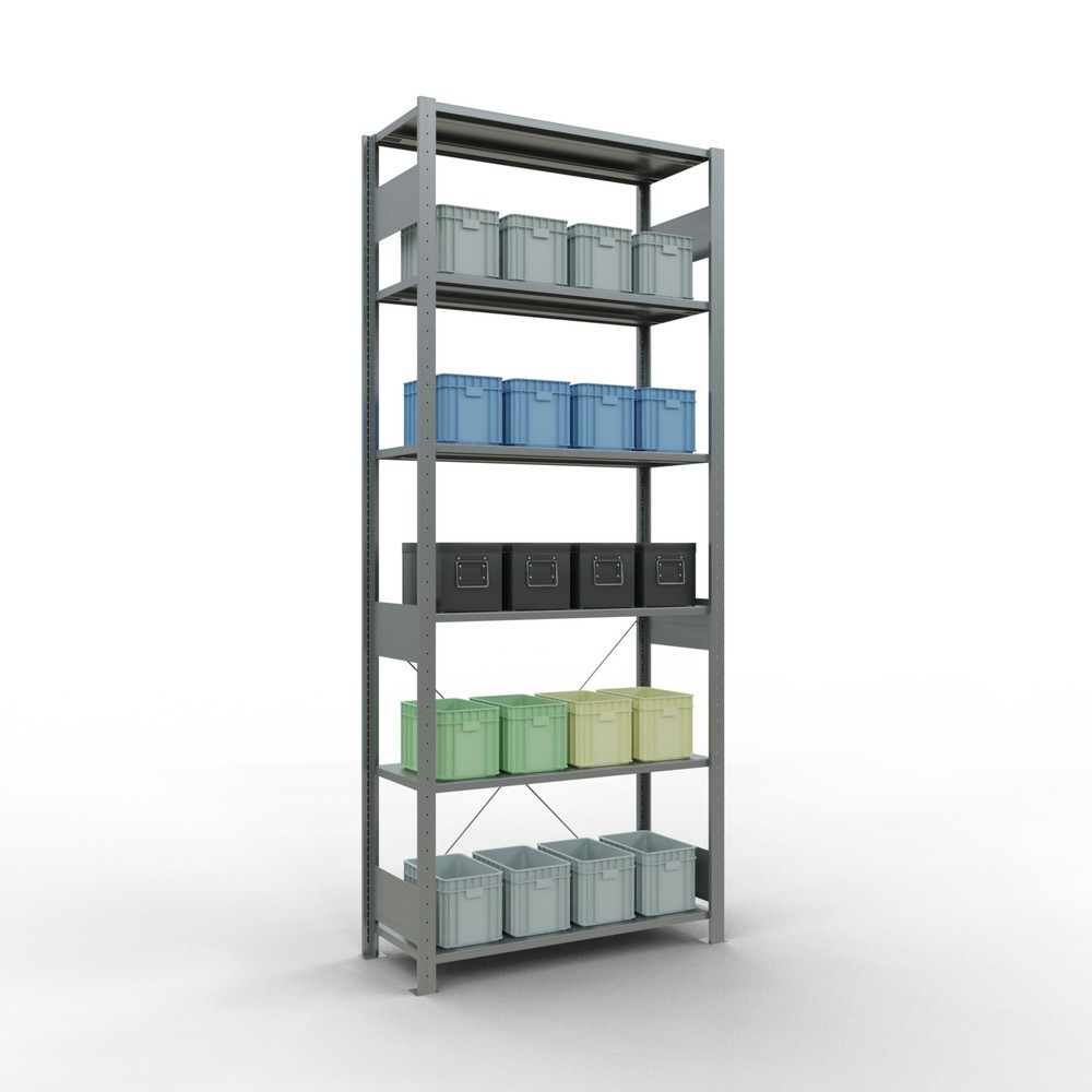 Le montage par enfichage vous permet un montage simple et rapide du module de base. Le renforcement par croisillons et la finition en acier de qualité supérieure garantissent stabilité et résistance. Les tablettes se règlent toutes en hauteur par crans de 25 mm pour vous permettre d'adapter les écartements de manière individuelle à des articles de stockage particulièrement grands ou de petite taille. Ce qui vous permet d’exploiter la surface de rayonnage de manière efficace. En outre, des tablettes supplémentaires ou des travées auxiliaires vous permettent d’agrandir votre rayonnage à tablettes. La qualité est garantie par le label de qualité RAL-RG 614/1 pour rayonnages à tablettes.
